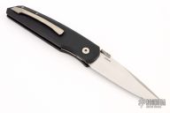 This D/A Harkins ATAC has a satin plain edge blade that has a thumbdisc and false top edge. The handle has a black aluminum frame with carbon fiber inlays, one of which is a hidden button to fire the knife. Tip up orange peel finished titanium clip. Comes with original box and papers. Has a couple light scuffs, otherwise excellent condition.