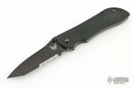This knife features a black finish tanto blade with partially serrated edge. Textured black G10 scales and titanium liners with a tip down black stainless steel clip. Nice detent, blade centering favors the right side. Comes with original box, drawstring bag and papers. Excellent condition.