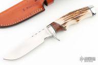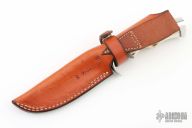 This knife by Ruffin Johnson features a hand mirror polished blade with .174" blade stock, .956" blade depth, hidden tang construction. The handle has a stainless steel guard and butt, wood and stag grip with black/white/aluminum spacers. Comes with a hand tooled brown leather sheath. Wolf logo onset on butt. Has a couple light scratches, otherwise excellent condition.