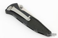 This Socom Elite manual linerlock folder by Microtech Knives has a partially serrated tanto stonewashed blade with notched thumbrest and dual thumbstuds. Has a black aluminum handle with non-slip inlays, tip down stainless steel clip. Serial number 00607 and dated 12/2006. Has some scuffs and scratches, wear on the frame, has used and sharpened, good user condition otherwise. Comes with original box and papers.
