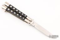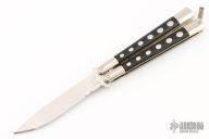 This Balisong by Benchmade features a tumbled blade. The handles are zanak with black plastic inlays. Has a few light scratches, otherwise excellent condition. Comes with a black nylon sheath.