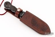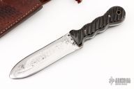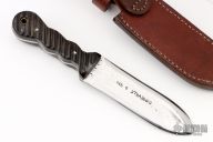 This knife features a mirror polished double edged blade with .185" blade stock and 1.588" blade depth, full tang construction. The handle has buffalo horn scales.  Includes a brown leather sheath.  There is some separation between the scales and tang.  Has some scuffs/scratches otherwise the knife is in excellent condition.