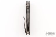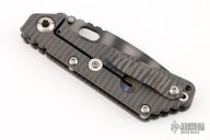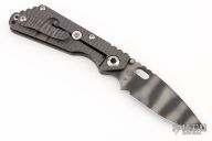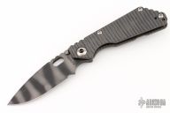 This Mick Strider Performance Series SMF framelock folder features a tiger striped drop point blade with thumbhole and notched thumbrest. The handle has a flamed titanium frame with titanium clip, tip up carry. Jimping on blade spine. Includes Hinderer "Lock Bar Stabilizer" for maximum reverse lock retention. Nice detent, lockup and blade seating. Has a couple light scuffs on the blade, otherwise excellent condition.