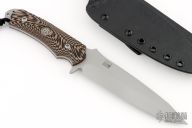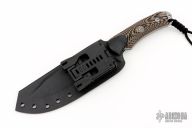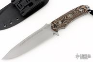 This Hide Fighter by Steve Woods and Wilson Combat features a bead blasted blade with a fuller on one side, .200" black stock and 1.606" blade depth, full tang construction. The handle has black/tan G-10 scales. Comes with a kydex sheath, challenge coin and COA. New from maker!