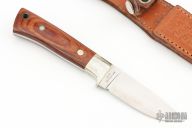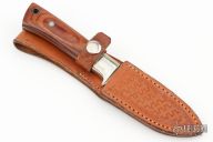 This knife by Sharp features a satin finished blade with .134" blade stock and 1.014" blade depth, full tang construction. The handle has nickel silver bolsters, laminated wood scales, lanyard hole. Comes with a brown leather sheath. Has some light scratches, otherwise excellent condition.