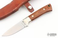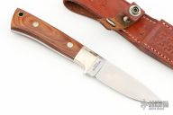 This knife by Sharp features a satin finished blade with .144" blade stock and 1.017" blade depth, full tang construction. The handle has nickel silver bolsters, laminated wood scales, lanyard hole. Comes with a brown leather sheath. Excellent condition.