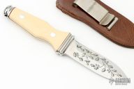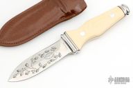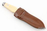 This is a very attractive boot knife from AG Russell. Blade is .158" thick at the ricasso and 1.088" deep at the ricasso and double-edged. Scales are ivory paper micarta with black liners. Integral construction with aluminum pins. Unusual piece. Comes with brown leather sheath. Has a few light scratches, otherwise excellent condition.
