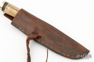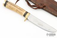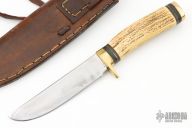This knife (has a mark scribed on the blade but can't read it, looks like it might be "Hampn"? and a symble or something) has a polished blade with .137" blade stock and 1.035" blade depth, hidden tang construction. The handle has a brass guard and butt with a stag grip and brass/leather spacers. Comes with a brown leather sheath. Has some light scratches and patina, otherwise good condition.