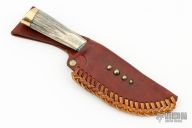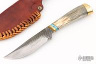 This knife by Alan Gerber features a satin finished blade with hidden tang construction, .201" blade stock and 1.191" blade depth. The handle has a brass guard and butt, stag grip with black/brass/turquoise spacers. Comes with a brown leather sheath. Has some light patina, otherwise excellent condition.