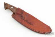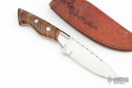 This Hunter by Steve Powers features a polished drop point blade with fileworked spine, .161" blade stock and 1.250" blade depth, full tapered tang construction. The handle has dovetailed stainless steel bolsters, tigerwood scales over red liners. Includes a hand tooled brown leather sheath with belt loop. Has a few light scratches, otherwise excellent condition.