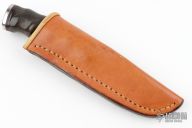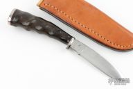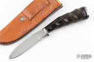 This knife by James Porter features a satin finished blade with fileworked thumbrest, .159" blade stock and 1.006" blade depth, hidden tang construction. The handle has a nickel silver guard and butt with a kudu horn grip, red/black spacers. Comes with a brown leather sheath. Has a few light scratches, otherwise excellent condition.