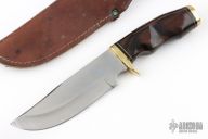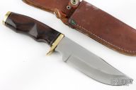 This knife was made in Japan, it has a satin finished blade with .167" blade stock and 1.665" blade depth, hidden tang construction. The handle has a brass guard and butt, rosewood grip with black/brass spacers. Comes with a brown leather sheath. Has some light scratches, otherwise excellent condition.