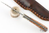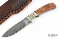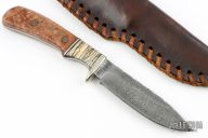 This knife by Larry Garoutte features a Damascus blade with fileworked spine, .152" blade stock and 1.069" blade depth, full tang construction. The handle has a nickel silver guard, maple burl and mammtoh tooth scales with mosaic pins and black liners, black/nickel silver spacers, fileworked tang. Comes with a brown leather sheath. Has some light patina, otherwise excellent condition. #285 on the blade.