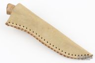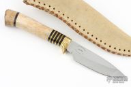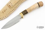 This knife by TT Freesemann features a mirror finished blade with .158" blade stock and 1.153" blade depth, hidden tang construction. The handle has a brass guard, oosic grip with black/brass spacers. Comes with a brown leather sheath. "S4"  on the blade. Excellent condition..