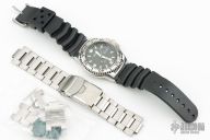 This watch comes with a rubber/plastic band attached. Also includes stainless bracelet, and Has scuffs and scratches throughout, good condition.