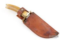 This knife by Don Szabo features a satin finished blade with .158" blade stock and 1.376" blade depth, hidden tang construction. The handle has a brass guard and butt and a stag grip. Comes with a brown leather sheath. Dated 1980. Has some scratches and pitting, otherwise good user condition.
