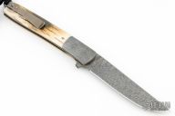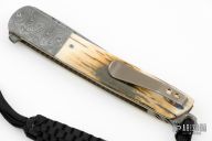 This Urban Trapper Flipper by Brad Zinker features a Mike Norris Fireclone Damascus blade with checkered thumbrest and flipper. The handle has dovetailed Damascus bolsters, mammoth ivory scales, anodized titanium liners with laser engraved interiors and a tip up anodized titanium clip, has a fileworked Damascus backspacer with lanyard hole. Rides on bearings, nice detent, lockup and blade seating. Comes with zippered case. Excellent Condition.