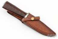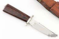 This Small Fighter by Elrod features a mirror finished blade with hand rub satin finished flats, false top edge, .190" blade stock and 1.001" blade depth, hidden tang construction. The handle has a nickel silver guard, dark wood grip with nickel silver butt, black and nickel silver spacers. Comes with a brown leather sheath. Has a few light scratches, otherwise excellent condition.