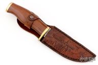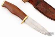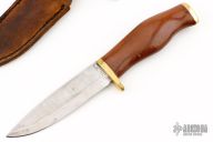 This knife by V.R. (please let us know if you know who this is) features a satin finished blade with .087" blade stock and 1.211" blade depth, hidden tang construction. The handle has a brass guard and butt with mesquete wood grip. Coems with a hand tooled brown leather sheath. Has some oxidation spots and a thin crack in the handle, otherwise good condition.