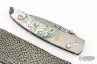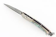 This knife by William Henry Fine Knives features a Damascus drop point blade with a single thumbstud.  The handle has a titanium frame with abalone scales.  Includes a lizard skin slip sheath.  This knife is a one-off according to the consignor.  Has a light scratch or two otherwise it is in excellent condition.