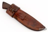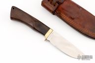 This knife by Benchmark Knives features a satin finished blade with .177" blade stock and 1.192" blade depth, full tang construction. The handle has a brass guard, rosewood scales with a lanyard hole. Comes with a brown leather sheath. Has scratches, has been sharpened, otherwise good user condition.