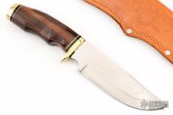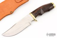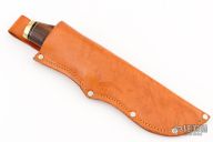 This knife was made in Japan, it has a satin finished blade with .187" blade stock and 1.649" blade depth, hidden tang construction. The handle has a brass guard and butt, rosewood grip with black/brass spacers. Comes with a brown leather sheath. Has some light scratches, otherwise excellent condition.