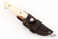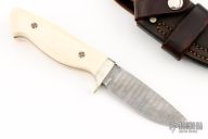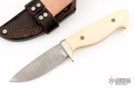 This hunter by Jim "Bocki" Backer features a Damascus blade with .149" blade stock and 1.093" blade depth, full tang construction. The handle has a nickel silver guard, camel bone scales with mosaic pins. "2008" and "BOCKI" on the guard.  Comes with a brown leather sheath. Excellent condition.