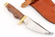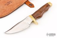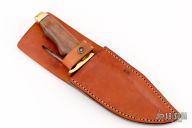 This knife by Art Wiman features a mirror finished blade with false top edge, .321" blade stock and 1.475" blade depth, hidden tang construction. The handle has a brass guard and butt, pecan wood grip with black spacers. Comes with a brown leather sheath. Has some light scratches and oxidation, otherwise good condition.