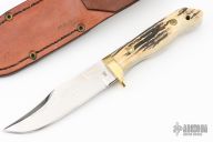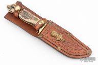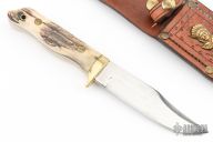 This knife by WJ Brown features a satin finished blade with false top edge and fuller, .184" blade stock and 1.148" blade depth, full tang construction. The handle has a brass guard with stag scales. Comes with a hand tooled brown leather sheath. Has some light scratches and patina, otherwise good condition.