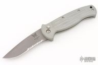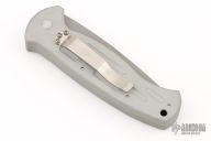 This AFO Automatic from Benchmade features a bead blast finished drop point blade with swedge and partial serrations. The handle has a bead blasted aluminum frame with a lanyard hole in pommeland a tip down stainless steel clip. Has a few scuffs, otherwise excellent condition. Comes with a Benchmade box and papers, but the box is for a 9000S with a black handle.