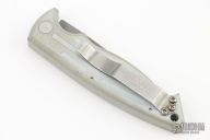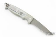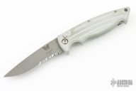 This Mini Reflex by Benchmade features a partially serrated blade and a bead blasted aluminum handle with stainless steel tip up clip, lanyard hole at the butt and safety on the spine. Has some light scuffs, otherwise excellent condition. Comes with original box and papers.