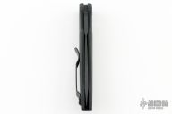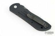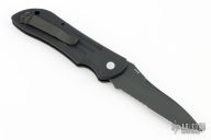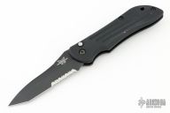 The Model 9100 Auto Stryker is the automatic version of Benchmade's Designer Series Stryker. Designed by Allen Elishewitz, the AutoStryker features a 3.5" 154CM drop point Tanto blade. The handle is made from 6061 T6 aircraft aluminum, hard anodized black for durability. This knife is designed for people who like the features of the Tanto blade shape, but do not want a chisel ground blade; the knife has a double bevel and is symmetrically ground. This one has a partially serrated black coated blade. Good strong action. Black tip up carry clip. Has some scratches on the frame, good condition otherwise. Comes with original box and papers