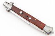 This 11" Picklock by Frank Beltrame features a mirror polished bayonet ground blade with false top edge. The handle has mirror polished stainless steel bolsters, front and rear, wood scales, mirror polished brass liners and stainless steel spring. Excellent condition. Comes with a leather slip sheath. This knife has been professionally tuned and polished by Greg's Effects. This knife is not a swivel bolster even though it appears to be. It might have been at one point, but it no longer functions as one.