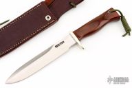 The Model 16-7 Diver or Special Fighter was designed especially for heavy-duty salt water use and is as nearly indestructible as possible. This knife has a 7.5" stainless steel blade with sharpened top edge and notched thumbrest, .210" blade stock and 1.179" blade depth, full tang construction. The handle has a nickel silver guard, and red linen micarta handle with a lanyard hole. Comes with a waxed brown leather sheath and original paper wrapping. Excellent condition.
