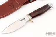 The Model 11 is the original drop-point blade. Designed by Tommy Thompson, noted Alaskan guide, in 1952 for big-game skinning, with point dropped below top of blade to prevent cutting too deeply through skins when used point first. The blade is satin finished with a notched thumbrest, .209" blade stock and 1.350" blade depth, hidden tang construction. The handle has a nickel silver guard, ironwood burl grip, black/duralumin spacers, duralumin butt with lanyard hole. Comes with a brown leather sheath and a Randall zippered case. Excellent condition.