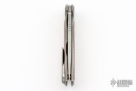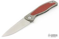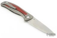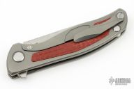 This F95NL framelock from Shirogorov features a flat ground tumble finished blade with notched flipper. The handle has a tumble finished titanium frame with a Monkey Edge Frag Pattern red G-10 inlay complimented by a tumbled titanium tip up clip and a single titanium barrel spacer at the butt along with a lanyard hole. Excellent lockup, strong detent, and nice seating. Excellent condition.