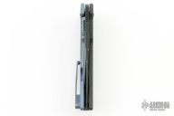 This Dominator by Darrel Ralph features a two-tone black tumble finished tanto blade with satin bevels, swedge, notched thumbrest and flipper. The handle is comprised of a carbon fiber "A" side scale, satin anodized titanium lockside with distressed tip up clip and titanium backspacer. Lanyard hole in pommel. Comes with maker's zipper case. Has some scuffs and scratches, great condition otherwise.