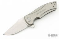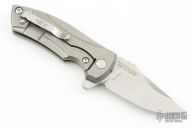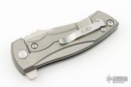 This knife by Zero Tolerance is a collaboration with Les George. Features a tumble finished blade with notched thumbrest and flipper. The handle has a tumble finished titanium frame with a tip up reversible clip, single black barrel spacer. Stainless steel lockbar insert and integral overtravel stop. #4413. Has scratches and has been sharpened, otherwise good condition.