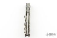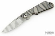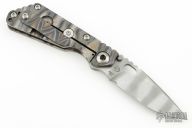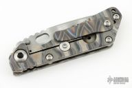 This JVA by Mick Strider is larger than a PT, but smaller than an SNG. It features a ghost striped blade with notched thumbrest and thumbhole. The handle has a flame finished titanium frame with matching tip up clip. Excellent Condition.