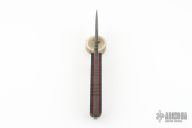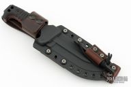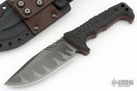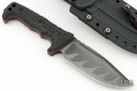 This Custom M-8 Compact by Miller Bros Blades features a clip point blade with notched thumbrest made from Z-Wear PM steel, .276" blade stock 1.644" blade depth, full tang construction. The handle has black G-10 scales with red liners, notched tang top and bottom. lanyard holes at the butt. Comes with a kydex/leather sheath. New condition. Comes with COA dated 2024