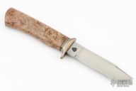 This custom knife by Journeyman Smith David Roeder features hand rubbed satin finished flat ground blade with false top edge, .235" blade stock and .947" blade depth, hidden tang construction. The handle has a bronzed and fluted 1018 steel guard, stabilized maple burl grip. New from maker.