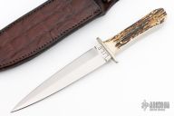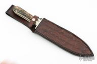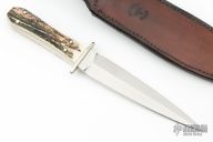 This Arkansas Toothpick by Jimmy Lile features a hand rub satin finished double edged blade, .182" blade stock and 1.123" blade depth, full tapered tang construction. The handle has a nickel silver double guard, stag scales and nickel silver pins. Comes with a hand tooled brown leather sheath. Has a few light scratches, otherwise excellent condition.