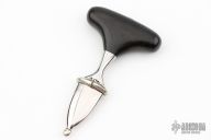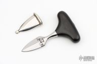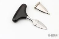 This miniature push dagger by Francis Boyd features a satin finished double edged blade with .131" blade stock and .539" blade depth, hidden tang construction with an ebony grip. Comes with a nickel silver scabbard. Excellent condition.