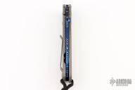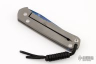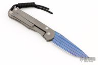 This Small Sebenza by Chris Reeve Knives features a Blued Damascus blade with single thumbstud, and notched thumbrest. The handle is titanium with engraving on one side and bead blast titanium with bead blast titanium clip, tip up carry. Has titanium barrel spacer. Nice detent, lockup and blade seating. Excellent condition. "B 98" on the inside of the frame.