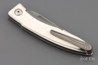 This Mnandi by Chris Reeve Knives features a Devin Thomas Stainless Basketweave Pattern Damascus blade with thumb grooves and notched thumbrest. The handle is comprised of a two-tone titanium frame with mammoth ivory inlays. Machined titanium tip up clip. Comes with original box, cloth, leather slip, tool, lube, and papers dated September 28, 2017. Excellent condition.