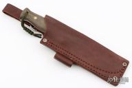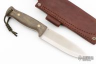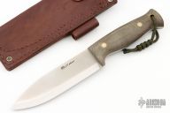 This knife by LT Wright features a satin finished scandi ground blade with .160" blade stock and 1.472" blade depth, full tang construction. The handle has green micarta scales with brass/stainless pins. Comes with a brown leather sheath and original box. Excellent condition.