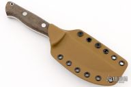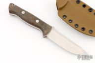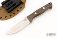 This Bravo-1 by Bark River Knives features a satin finished blade with notched thumbrest, .220" blade stock and 1.112" blade depth, full tang construction. The handle has green canvas micarta scales with lanyard hole. Comes with a Kydex sheath and original box. Excellent condition.