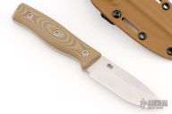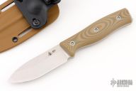 This GSO 3.5 from Survive Knives features a stonewashed drop point blade with notched thumbrest, .143" blade stock and 1.130" blade depth, full tang construction. The handle has G10 scales over full tang construction. Includes kydex sheath with belt clip. Excellent condition.