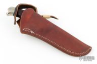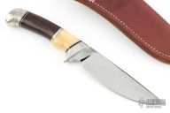 This Hunter by Bernard Sparks features a mirror polished blade with .235" blade stock and 1.245" blade depth, hidden tang construction. The handle has a nickel silver guard and butt, stag and cocobolo grip with black spacers. Comes with a brown leather sheath. Has some scratches, has been resharpened, otherwise good condition.