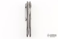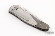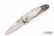 This California Open Djinn by Allen Elishewitz features a Damascus blade with a steped thumb lug. The handle has a two tone titanium frame with carbon fiber rear bolsters, black G-10 backspacer, tip down bead blasted stainless steel clip. Has a few light scratches, otherwise excellent condition. Comes with a zippered case. When you press the toggle on the frame, the blade opens a little, then you can use the thumbstud to open it the rest of the way, press it again to unlock the knife.